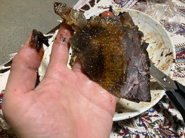 ちなみに残った皮はこんなかんじ。とりきれてない毛根が残っていますが、パリパリの揚げ焼きになってるので食べられないことはありません。うまくもないけどね。
